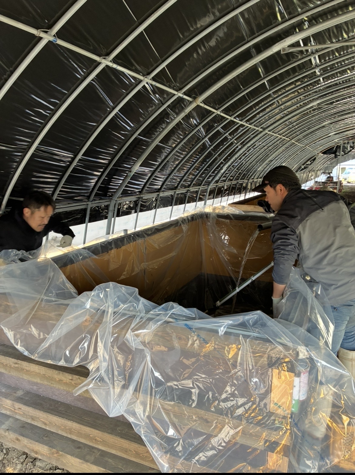 今日はサティアンの水槽ビニール張りをしました。シワがよらないよう水を入れながらビニールを張っていきます。