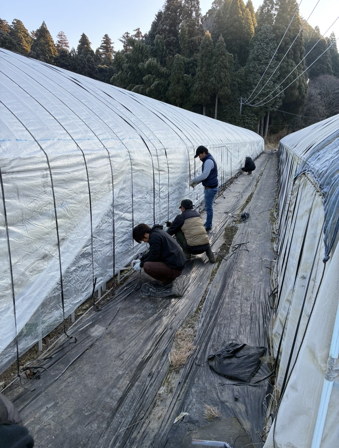 今日はたつやさんのビニール張りをしました。各々ハウスがあるのでビニールを張る時はみんなでします。霜が降りだので難なく終わりました。次は私とゆうくんのビニール張りがあるので宜しくお願いします🙇